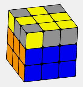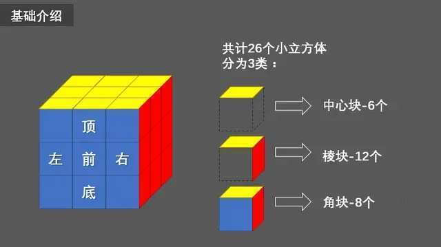 三阶魔方共有6个面(有6个中心块),每个面都有各自的颜色共6种颜色,12条棱边(棱边中间块即为棱块-亦有12个),8个顶角(每个顶角上对应一个角块)。