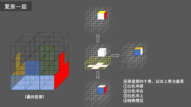 ③还原底部四个角,以右上角为基准,白色冲上。此时需要先把白块移动到侧边,然后再看是在左侧还是在右侧,之后判断是①和②的哪一种,分别再运用上面两个公式之一。
