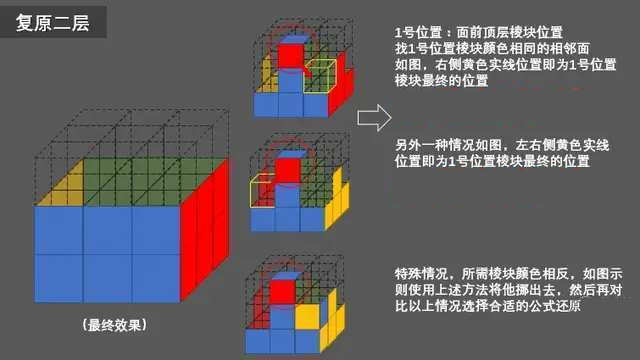 如果发现顶部没有第二层棱块的颜色,可以在其他棱边中心块处找找,然后做一遍公式替换到顶层,再根据以上2种情况处理。这样四个棱块都对齐,第二层就完成啦。