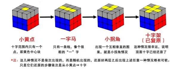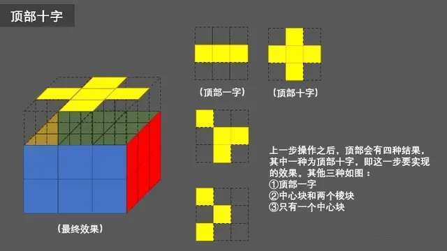 三阶魔方底部十字还原,没有具体的公式。可分为两步,先做成顶部小花,再对齐中心角块颜色。效果如下图所示: