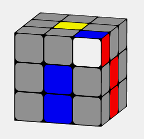 ①还原底部四个角,以右上角为基准,白色冲右。寻找与白色角块其他面相同颜色的中心块,如图,则白色角块的最终位置为图中黄色框白底的区域。白块在右侧公式为:U'L'UL(上'左'上左),动图演示如下: