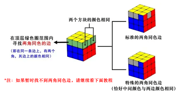 顶层黄色还原后,我们接下来需要处理顶部边角还原,先找到两角同色边。再做
