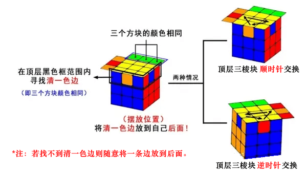 先找到清一色边,把清一色边放到后面,选择顺逆任意公式操作后观察选择对应的顺逆公式直到完成魔方: