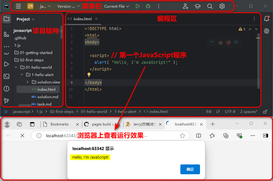 2、开始编写第一个JavaScript HelloWorld程序,并运程结果;
