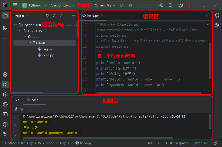 2、编写第一个Python HelloWorld程序,并运行结果;